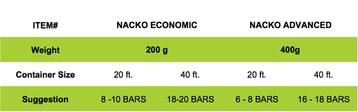 Nano Charcoal’s patented Nano-Technology makes NACKO a true high-performance adsorption bar. NACKO adsorbs reliably distinctive odors, gases and moisture during shipment.